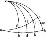 In unica descriptione complectar trianguli orthogonii sphaeralis data: nam ex orthogonio sequuntur praecepta reliquorum triangulorum. Sint ergo in superficie sphaerae quadrantes circulorum maiorum ab, bc angulum b rectum continentes. Quo fit ut c punctum sit polus ipsius ab circuli; et a punctum ipsius bc vicissim polus. 33 A quibus polis ad ipsos circulos rursum quadrantes descendant cd, ae se vicissim in puncto f secantes. Item a polo c alii duo quadrantes utrinque ab ipso cd descendant cgh, clk qui secent quartas ae, ab in punctis g, h, k, l26. Atque ut praeceptorum fundamentum melius intelligatur, ita hos quadrantes disponam: ut sinus arcus cf sit medius proportionalis inter sinum totum et sinum arcus ce. Et etiam inter sinum arcus cg et sinum arcus cl. Quare fiet, sicut sinus totus ad sinum arcus cg sic sinus arcus cl ad sinum arcus ce. Quibus suppositis, haec sequuntur. 34 Aggregatum ipsorum arcuum fa, ad erit quadrans: et ipsi arcus in maxima differentia. Et sinus arcus cf aequalis sinui anguli afd item arcus fg, dk aequales inter se. Et ipsi arcus fl, dh inter se aequales. Unde et ipsi ag, kb arcus aequales invicem: et ipsi ah, le arcus aequales erunt invicem. Item sinus arcus cg erit et sinus anguli alk. [A:10v] Et e contrario, sinus arcus cl erit et sinus anguli agh. Adhuc secto per medium arcu be in puncto M ratio sinus aggregati arcuum ga, ah ad sinum differentiae eorundem arcuum, erit sicut quadratum sinus arcus cM ad quadratum sinus arcus Mb. 35 Eandemque rationem habebit sinus aggregati arcuum la, ak ad sinum differentiae eorumdem: et eandem sinus aggregati arcuum fa, ad ad sinum eorum differentiae. Et similiter in omni triangulo sphaerali orthogonio inter quadrantes ae, ab constituto. Sicut igitur ipsorum arcuum fa, ad aggregati sinus maximus est, quia scilicet sinus quadrantis ac semidiameter sphaerae: sic et ipsorum arcuum fa, ad maxima est differentiarum, quae in reliquis triangulis orthogoniis inter quartas ae, ab positis.