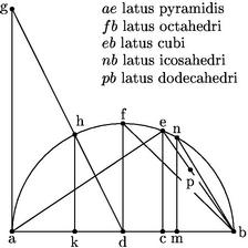 62 Data sphaerae diametro, dabuntur latera pyramidis, octahedri, cubi, icosahedri, atque dodecahedri solidorum intra sphaeram ipsam inscriptorum. Esto sphaerae diametros ab quae secetur in puncto c ita ut ac sit dupla ipsius cb. Et a puncto c excitetur usque ad periferiam semicirculi super ab diametrum descripti linea ce perpendicularis. Et coniungatur punctum e cum extremis diametri, per lineas ae, eb. 63 Eritque ae latus pyramidis, eb autem latus cubi. Item a centro semicirculi d perpendicularis item ad diametrum usque ad periferiam educatur df. Et coniuncta fb, erit latus octahedri. Adhuc erigatur ipsi ab perpendicularis et aequalis linea ag et connectatur gd, quae secet periferiam semicirculi in puncto h, a quo perpendicularis cadat ad diametrum hk. 64 Et quoniam ag dupla ipsius ad, iam et hk dupla ipsius kd erit, propter similitudinem triangulorum agd, khd et ideo quadratum hk quadruplum ad quadratum kd, et ideo quadratum hd quincuplum ad quadratum kd. Verum hd tripla31 ipsius cd, et ideo quadratum hd nonuplum ad quadratum cd. 65 Igitur dk maior quam cd. Ponatur ergo ipsi dk aequalis dM. Et excitata perpendicularis a diametro ad perife[A:14r]riam usque prodeat Mn. Nam coniuncta nb, erit latus icosahedri. Demum, sicut est hk ad ka, sic sit, per 7am huius, linea eb ad pb. 66 Eritque pb latus dodecahedri: nam sicut ex 11a Secundi Elementorum facillime constare potest, vel per conversionem per conversionem primae tredecimi; si linea haec hk secetur secundum extremam mediamque rationem, maius segmentum eius erit ak. Quamobrem eb, quod est latus cubi, in puncto p divisum ita ut sicut est hk ad ka sic sit eb ad bp: secundum extremam mediamque rationem secabitur. Quare maior eius portio bp erit latus dodecahedri, sicut in 18a tredecimi Elementorum diffuse ostensum est.